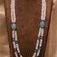 Double line moonstone beads mala combined with semiprecious blue stones & sterling silver rings.